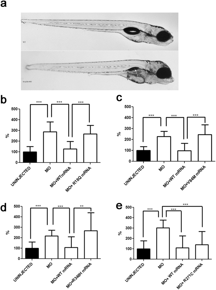 Figure 6. In vivo modelling of Kir4.1 mutations in zebrafish.(a) Transient kcnj10a knockdown zebrafish show macroscopic abnormalities in organ development compared to wild-type (WT). In morphant embryos, the pronephric duct is visible because it is dilated (black arrow); the swim bladder is not visible (white arrow). (b–e) Number of spontaneous tail flicks (registration time 30sec) seen in WT and mutant 30 hpf embryos. Values are expressed as percent of flicks counted in uninjected embryos. Embryos injected with MO (b–e), and with equimolar amount of MO and either R18Q (b), V84M (c), and R348H (d) mRNA show an increased rate of spontaneous contractions, compared to uninjected embryos (b–e), and to either MO+WT (b–e) and MO+R271C (e) mRNA injected embryos. **p < 0.01; ***p < 0.001. |