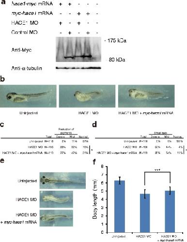Fig. 2. Dorsal depletion of hace1 leads to multiple developmental defects. a Immunoblot analysis shows that HACE1 MO inhibited translation of hace1-myc mRNA but not that of myc-hace1 mRNA used for rescue experiments. Xenopus laevis embryos were injected with the indicated sets of MOs (30 ng) and mRNAs (1.2 ng). α-tubulin was a loading control. b Embryos were injected with 30 ng of HACE1 MO alone (middle panel) or 30 ng of HACE1 MO plus 1.2 ng of myc-hace1 mRNA (right panel) into the animal region of two dorsal blastomeres at the four-cell stage. c, d Embryos were classified into severe, mild, and normal groups on the basis of the extent of each defect. *Pâ<â0.05 (with Bonferroni correction), MannâWhitney U-test. c