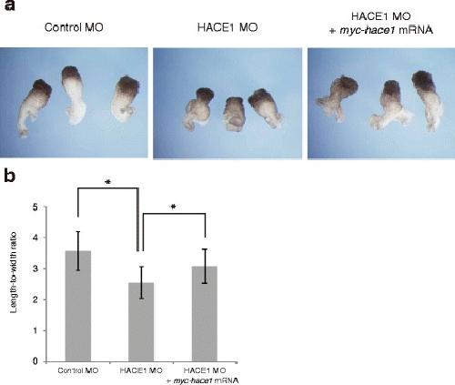 Fig. 5. Knockdown of hace1 by HACE1 MO2 leads to a phenotype similar to that caused by HACE1 MO treatment. a Embryos were injected with 50Â ng of Control MO (left panel) or 50Â ng of HACE1 MO2 (right panel) into dorsal blastomeres at the four-cell stage and fixed at stage 38/39. Representative results from two independent experiments are shown (Control MO, nâ=â39; HACE1 MO2, nâ=â40) (b, c) Embryos were classified into severe, mild, and normal groups on the basis of the extent of each defect. b