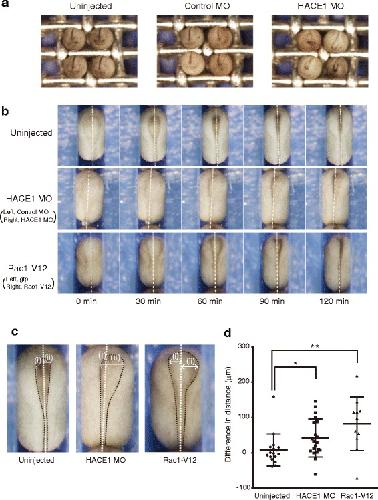 Fig. 4. Knockdown of hace1 and overexpression of rac1-V12 cause a delay in neural tube closure. a Embryos were injected with the indicated MOs (30 ng) into the animal region of two dorsal blastomeres at the four-cell stage and the images were collected at stage 20. Anterior views with dorsal to the top. Representative results from two independent experiments are shown. b HACE1 MO (15 ng) was injected into the animal region of the right dorsal blastomere, and control MO (15 ng) was subsequently injected into that of the left dorsal blastomere. rac1-V12 (constitutively active Rac1) mRNA (10 pg) and gfp mRNA (90 pg) were injected into the animal region of the right dorsal blastomere, and then gfp mRNA alone was injected into the animal region of the left dorsal blastomere. Embryos at stage 13 were placed on a culture dish, and images were collected every 5 min until embryos completed neural tube closure. Still frames from a time-lapse movie show embryos from stage 14 (0 min) to stage 18 (120 min). Dorsal views with anterior to the top. Dotted lines indicate the midline. Transient posterior protrusion (e.g., middle left) was sometimes observed because embryos were firmly embedded in the agarose groove and thus were constantly subjected to the lateral-to-medial force. c A magnified view of embryos in b (60 min). Black dotted lines indicate the inner edges of neural folds. d The maximum distance between the dorsal midline and the left (i) or right (ii) inner edge of the neural fold was measured (shown as white double-headed arrows in c). The differences ((ii) minus (i)) were then calculated and plotted (Uninjected, nâ=â17; HACE1 MO, nâ=â20; Rac1-V12, n=11). Long central bar marks mean and upper and lower bars mark s.d. *Pâ<â0.05, **P<0.01, MannâWhitney U-test |