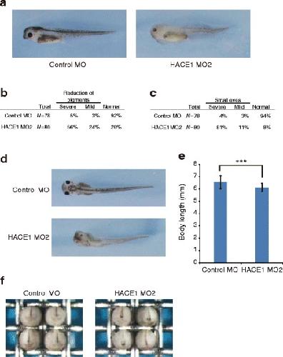 N, number of total eyes we evaluated. The right eye and left eye of each embryo were separately evaluated. d, e The body length of embryos at stage 38/39 was quantified (Control MO, nâ=â39; HACE1 MO2, nâ=â40). Values are expressed as the meanâ±âs.d. ***Pâ<â0.001, unpaired t-test. f Embryos were injected with 50 ng of Control MO (left panel) or 50 ng of HACE1 MO2 (right panel) into dorsal blastomeres at the four-cell stage and the images were collected at stage 20 (Control MO, nâ=â40; HACE1 MO2, nâ=â40). Anterior views with dorsal to the top |