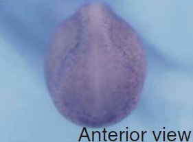 hace1 (HECT domain and ankyrin repeat containing E3 ubiquitin protein ligase 1) gene expression in Xenopus tropicalis embryo, assayed via in situ hybridization, NF stage 23, anterior view, dorsal up. |
