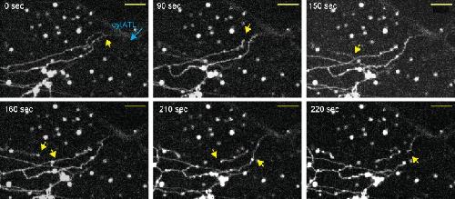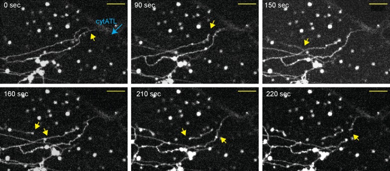 Figure 3. Real-time disassembly of an ER network in the presence of cytATL.A network was formed from a crude Xenopus egg extract in the presence of the dye DiIC18 in a computer-controlled microfluidics device. CytATL-GFP (5 µM) in cytosol containing an energy regenerating system was then slowly perfused into the chamber at a total laminar flow rate of 0.5 µL/min from multiple ports (one is indicated by a blue arrow). The arrival of cytATL- GFP arrival in the chamber was monitored by GFP fluorescence (not shown). Images represent snapshots of a real-time video (see Video 3). Yellow arrows point to the detachment or breakage of tubules. Scale bar = 10 µm.DOI:
