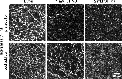 Figure 6—figure supplement 1. ER network maintenance is less sensitive to ATL inhibition than ER network formation.GTPγS was added at 1 mM or 2 mM either before (upper panels) or after (lower panels) formation of an ER network from Xenopus egg cytosol (C), light membranes (M), and an energy regenerating system. The membranes were stained with octadecyl rhodamine. Scale bar = 10 µm.DOI: