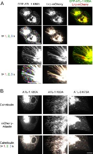 http://dx.doi.org/10.7554/eLife.18605.018Figure 7—figure supplement 1. Co-overexpression of ATL mutants and Rtn4a in U2OS cells.(A) Peripheral ER network in a U2OS cell expressing a high level of mCherry-tagged Rtn4a and GFP-ATL-1 R217Q, a dimerization defective mutant. Scale bar = 10 µm. (B) Peripheral ER network in a U2OS cell expressing a high level of mCherry-tagged Rtn4a and GFP-ATL-1 K80A, a GTPase defective mutant. The second column shows three time points for both the ATL and Rtn channels. Stationary pixels appear white, while those moving appear in colors. Scale bar = 10 µm.DOI: