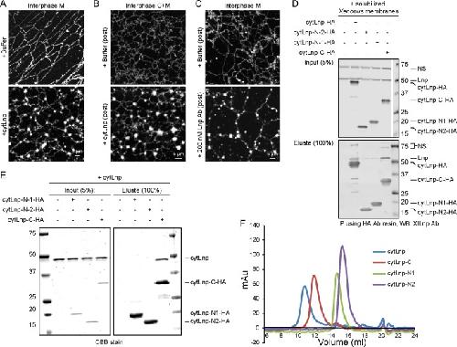 http://dx.doi.org/10.7554/eLife.18605.027Figure 11—figure supplement 1. Cytoplasmic fragments of Lnp interfere with the function of endogenous Xenopus Lnp.(A) Light membranes (M) were incubated with an energy regenerating mix and either buffer or 5 µM cytLnp for 15 min. The membranes were stained with octadecyl rhodamine. Scale bar = 5 µm. (B) Buffer or 5 µM of cytLnp was added to a preformed network formed from cytosol (C) and membranes (M). Scale bar = 5 µm. (C) Buffer or 200 nM of affinity-purified Lnp antibody was added to a preformed network formed from membranes only. Scale bar = 5 µm. (D) Interaction of endogenous Xenopus egg Lnp with various Lnp fragments. A detergent extract of light membranes was incubated with empty resin or hemagglutinin (HA)-tagged Lnp fragments (see Figure 11A). After pull-down with HA antibodies, the bound fractions were analyzed by immunoblotting with antibodies to Xenopus Lnp. (E) Interaction of purified Xenopus cytLnp with various cytLnp fragments. HA-tagged Lnp fragments (see Figure 11A) was incubated with cytLnp, and subsequently HA antibodies. Bound fractions were analyzed by SDS-PAGE and stained with Coomassie blue. (F) Purified cytLnp or fragments of it (see Figure 11A) were analyzed by gel filtration on a Superdex 200 column.DOI: