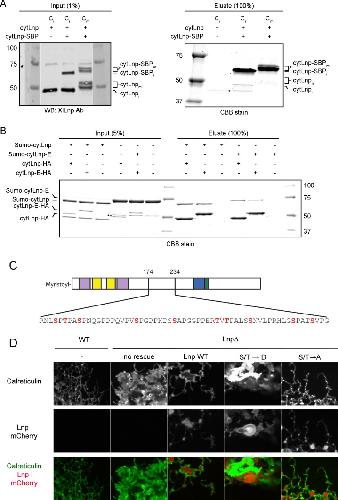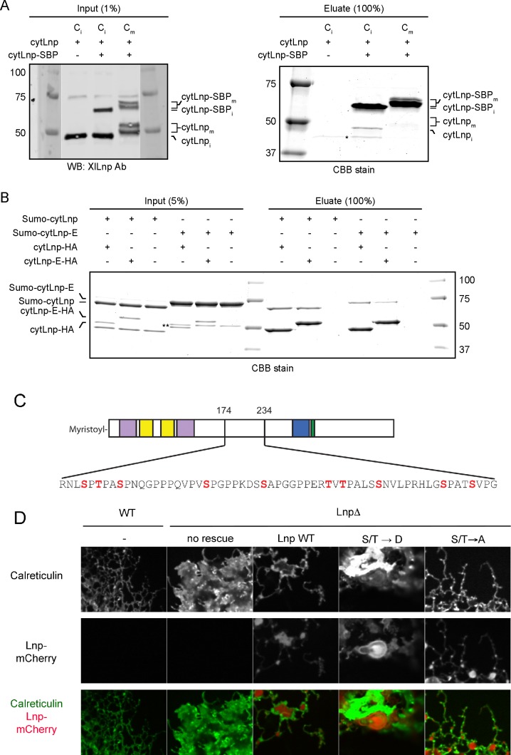 http://dx.doi.org/10.7554/eLife.18605.029Figure 12—figure supplement 1. Mitotic phosphorylation weakens Lnp-Lnp interaction.(A) Lnp-Lnp interaction is weakened during mitosis. Purified cytLnp and SBP-tagged cytLnp (cytLnp-SBP) were incubated with interphase cytosol in the absence or presence of cyclin B∆90. The samples were incubated with streptavidin resin, bound material was eluted with biotin, and analyzed by SDS-PAGE and staining with Coomassie blue. The left panels show the input material. (B) Purified cytLnp-HA or a phosphomimetic version of it (cytLnp-E-HA) were incubated with Sumo-tagged cytLnp (Sumo-cytLnp) or a phosphomimetic version of it (Sumo-cytLnp-E). Pull-downs were performed with anti-HA resin and the bound material was analyzed by SDS-PAGE and staining with Coomassie blue. (C) Lnp residues that were mutated to aspartate or alanine to generate phosphomimetic (S/T → D) or unphosphorylatable (S/T → A) mutants are shown in red. (D) Peripheral ER in Lnp-lacking U2OS cells (Lnp-/-) expressing GFP-calreticulin. Where indicated, the cells also stably express at low level mCherry-tagged wild type Lnp, or phosphomimetic or unphosphorylatable mutants. Scale bar = 10 µm.DOI: