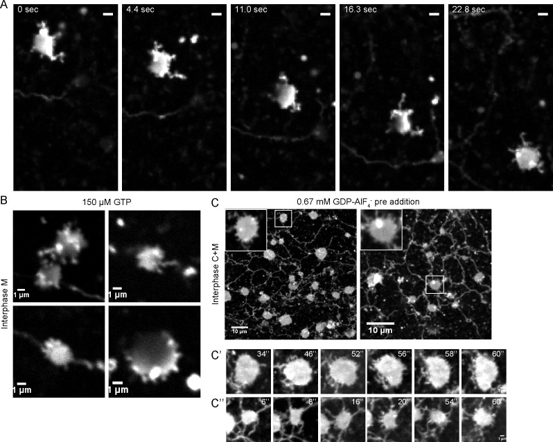 Figure 4. Intermediates during in vitro ER network formation.(A) DiIC18-prelabeled light membranes were mixed with buffer and an energy regenerating system. The sample was imaged immediately by confocal microscopy. Scale bar = 2 µm. (B) Xenopus egg light membranes were incubated in the presence of 150 µM GTP and octadecyl rhodamine. Scale bar = 1 µm. (C) Interphase Xenopus egg cytosol, light membranes, 0.67 mM GDP-AlF4-, and an energy-regenerating system were incubated for 30 min. The membranes were stained with octadecyl rhodamine. Scale bars = 10 µm. Insets and images in C’ and C’’ show magnified views of small sheets from which short tubules emanate. Scale bars = 1 µm.DOI: