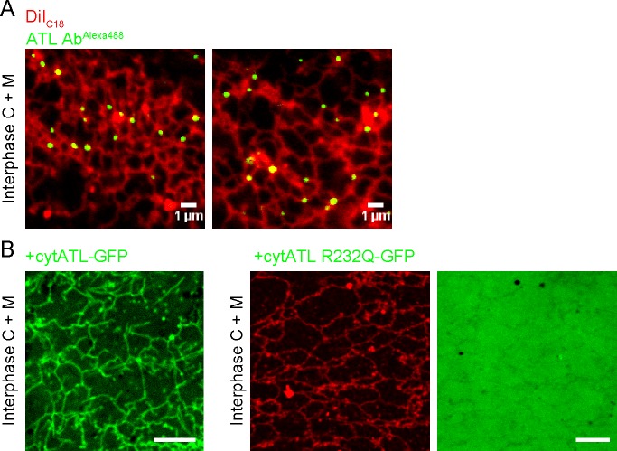 Figure 5—figure supplement 1. Localization of endogenous and inactivated ATL in a Xenopus ER network.(A) An interphase ER network was generated with cytosol, DiIC18-prelabeled light membranes, and an energy regenerating system. Endogenous ATL was visualized by including 10.5 nM Alexa488-labeled, affinity-purified antibodies against Xenopus ATL. The sample also contained sperm chromatin to stabilize the network by reducing thermal convection. Scale bars = 1 µm. (B) A mixture of interphase cytosol, light membranes, and an energy regenerating system was incubated in the presence of 0.5 µM cytATL-GFP, but absence of membrane stain,for 30 min (left panel). Parallel reactions were performed with 2 µM cytATL(R232Q)-GFP and the membrane stain octadecyl rhodamine (middle and right panels). Scale bars = 10 µm.DOI: