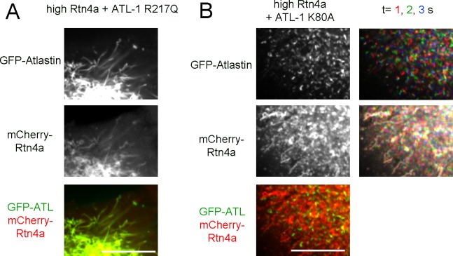 Figure 7—figure supplement 1. Co-overexpression of ATL mutants and Rtn4a in U2OS cells.(A) Peripheral ER network in a U2OS cell expressing a high level of mCherry-tagged Rtn4a and GFP-ATL-1 R217Q, a dimerization defective mutant. Scale bar = 10 µm. (B) Peripheral ER network in a U2OS cell expressing a high level of mCherry-tagged Rtn4a and GFP-ATL-1 K80A, a GTPase defective mutant. The second column shows three time points for both the ATL and Rtn channels. Stationary pixels appear white, while those moving appear in colors. Scale bar = 10 µm.DOI: