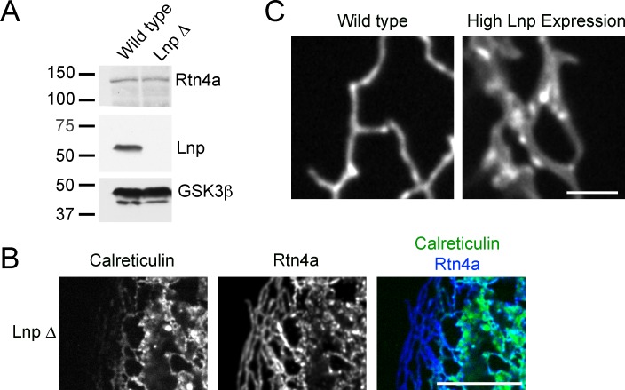 http://dx.doi.org/10.7554/eLife.18605.021Figure 8—figure supplement 1. ER morphology in U2OS cells lacking or overexpressing Lnp.(A) Extracts of wild type U2OS cells and a Lnp-deleted U2OS clonal cell line were analyzed by immunoblotting with Lnp and Rtn4 antibodies. Equal amounts of total protein were loaded, and GSK3β was used as a loading control. (B) Peripheral ER in a U2OS cell lacking Lnp expressing GFP-calreticulin from the endogenous promoter. The cells were fixed and analyzed for GFP fluorescence and for endogenous Rtn4a, using specific antibodies and fluorescently labeled secondary antibodies. Scale bar = 10 µm. (C) Peripheral ER in wild type U2OS cells and cells highly expressing Lnp-mCherry. The ER is visualized by GFP-calreticulin expressed under the endogenous promoter. Scale bar = 2 µm.DOI: