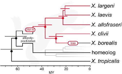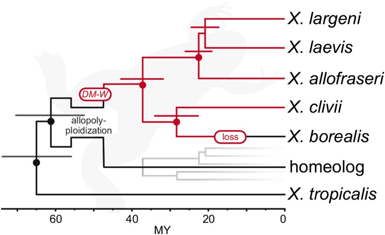 Figure 1. Phylogenetic relationships inferred from representative species in subgenus Xenopus suggests DM-W was gained before diversification of (4x = 36) tetraploids and then lost in an ancestor of X. borealis. This phylogeny was recovered from *Beast analysis of transcriptome data and is topologically consistent with those recovered from other analyses of nuclear DNA and of mitochondrial DNA. Dots over nodes indicate 1.0 posterior probability; bars above nodes indicate the 95% credible intervals for divergence time in millions of years (MY). All species depicted are tetraploids except the outgroup species, X. tropicalis, which is diploid. For this analysis, one homeolog from any one of the tetraploid species was included for each gene, and is indicated by the gray subtree (File S1, section S1.1). The timing of the origin of DM-W with respect to the allopolyploidization event (whether before or after) is unclear. Xenopus silhouette from Phylopic by Sarah Werning, CC04 license. |