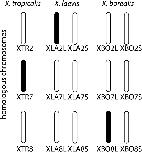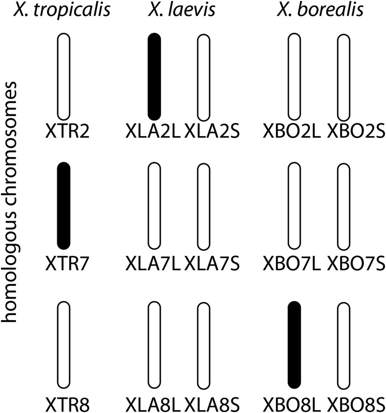 Figure 2. Sex chromosomes, indicated in black, in three species of African clawed frog are not homologous. For the tetraploid species, X. laevis and X. borealis, both homeologous (L and S) chromosomes are shown. Chromosome nomenclature for X. tropicalis and X. laevis follows (Matsuda et al. 2015). |