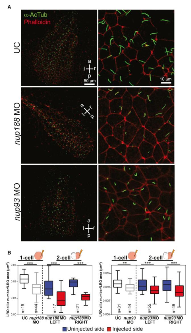 Figure 2. nup188 and nup93 Depletion Decreases Cilia in the LRO (A) LROs from embryos treated with the indicated MOs (or UC) stained with anti-acetylated α-tubulin (α-AcTub, green) to detect primary cilia, Phalloidin (red) marks the cell borders. p, a, l, and r denote posterior, anterior, left, and right, respectively. Right panels show a magnification of a representative region of the LRO. (B) Box plots of cilia number per LRO area (μm2) of embryos derived from injections at the 1- or 2-cell stage. Box depicts 25th to 75th percentiles with median marked by a horizontal line in the box. Whiskers indicate data range from smallest to largest values. n represents total number of embryos from three independent experiments. âââp < 0.0005, ââp < 0.005, Studentâs t test. |