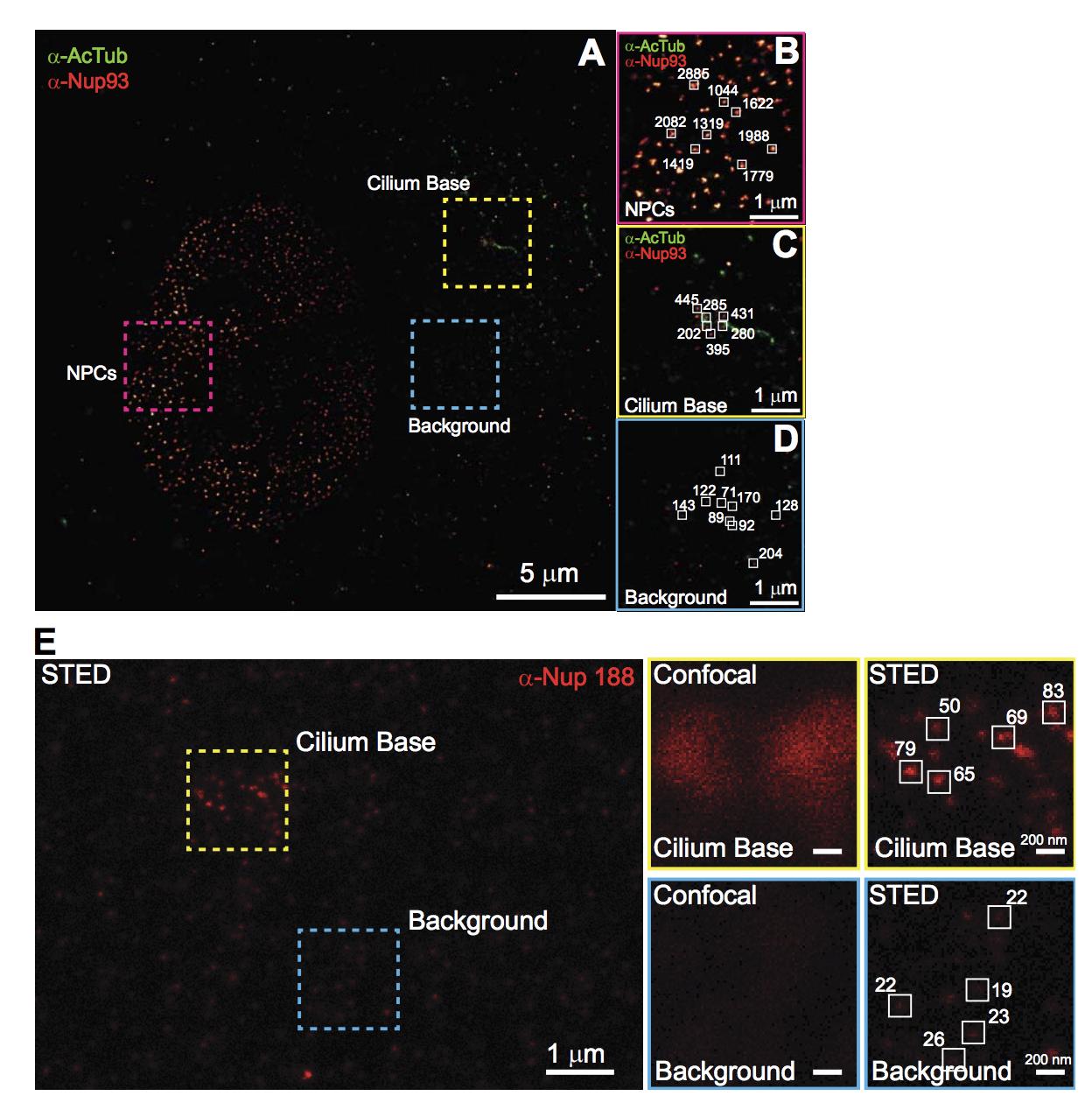 Figure S4 (related to Figure 5): Comparison of number of detections per cluster for both Nup93 and Nup188 in 2D-FPALM and fluorescence intensity in STED. (A) Two-color 2D-FPALM image of cell labeled with anti-AcTub (green) and anti-Nup93 (red). Three boxed ROIs from the nuclear surface, the cilium base, and the cellular background are magnified in B-D. (B-D) Magnification of the three ROIs shown in panel A showing number of localizations for a selected number of clusters (white boxes) in all three ROIs. (E) STED images of immunolabeled anti-Nup188 clusters at the cilium base. ROIs are selected from both the cilium base and the cellular background to show the increased fluorescence intensity (in arbitrary units) of clusters at the basal body (far right panels, white boxes). Diffraction limited confocal images are also shown in middle panels. |