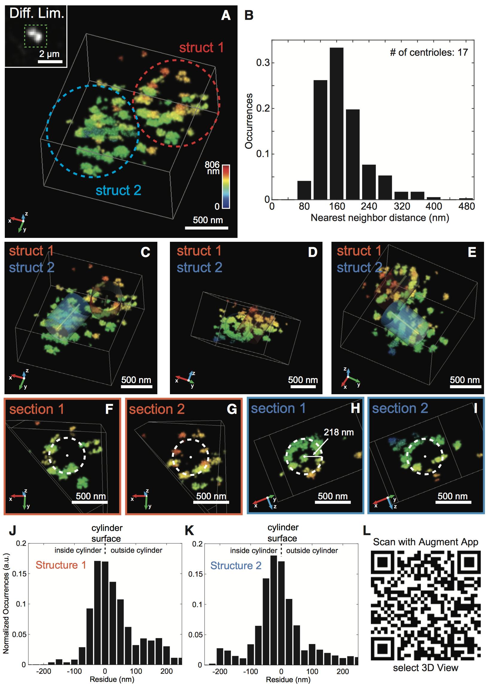 Figure 6. Nup188 Forms Two Barrel-like Structures that Encase the Centrioles (A) Diffraction-limited (inset) and 3D W-4PiSMSN super-resolution image of anti-Nup188 signal at the cilium base. Heatmap coloration reflects depth in z as depicted by scale. Individual structures are circled. See also Movie S2. (B) Nearest-neighbor distances from all localiza- tion clusters in all structures imaged were calcu- lated and plotted. (C–E) Rotated views of image in (A) where two cylinders (blue and red) have been fitted into both structures denoted by ‘‘1’’ and ‘‘2.’’ See also Movie S2. (F–I) Planar sections of each structure cut across the cylinder axis (central point). Dotted lines represent cylinders. (J and K) Distribution of the distances of individual localizations from W-4PiSMSN data inside (nega- tive values) and outside (positive values) the modeled cylinder surface of structure 1 (J) and structure 2 (K). (L) QR code to load Nup188 W-4PiSMSN structure into the 3D visualization application Augment. See Experimental Procedures for instructions. See also Figures S5 and S6. |