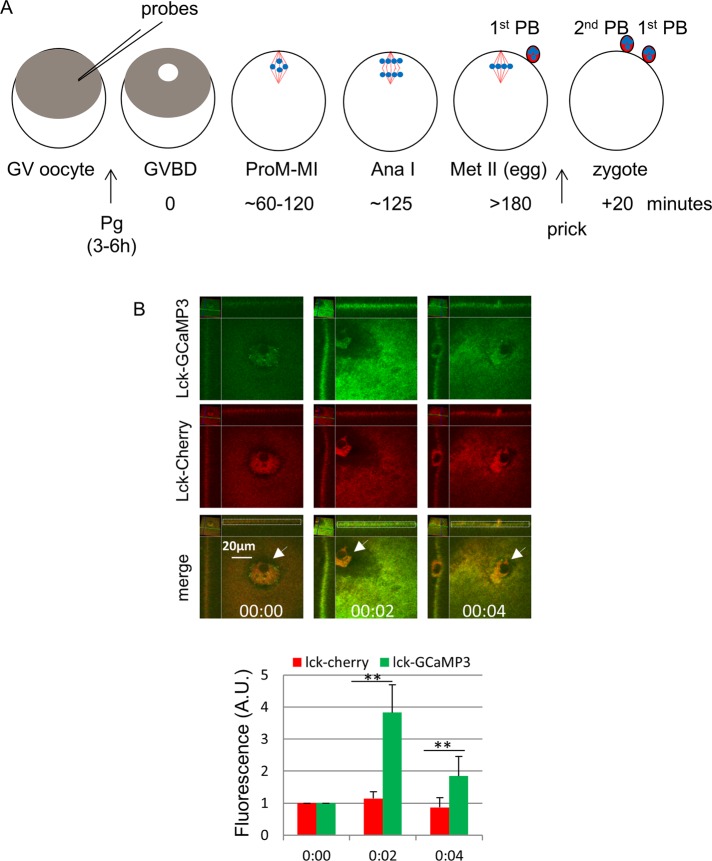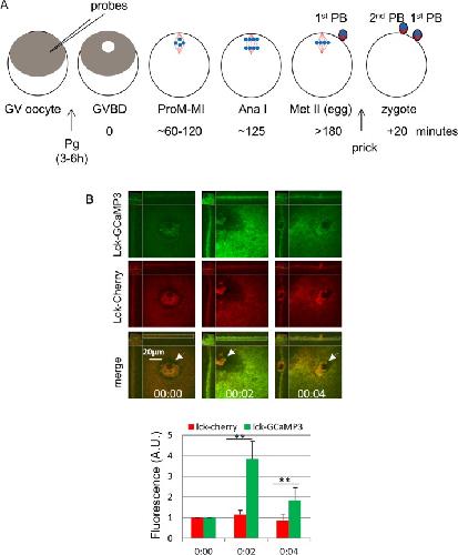 FIGURE 1:. Lck-GCaMP3–detected global calcium transients at egg activation. (A) Time line of experimental approach. All fluorescent probes (mostly mRNAs) were injected at GV stage. Frog oocytes (1.4 mm in diameter) exhibit a dark-pigmented animal hemisphere and a light vegetal hemisphere. GVBD is manifested with depigmentation at the center of the animal hemisphere (“maturation spot”), where all meiosis steps occur (and are imaged). Ana I, anaphase I; MI, metaphase I; MII, metaphase II; PB, polar body; Pg, progesterone; ProM, prometaphase; red lines, spindle microtubules; blue dots, chromosomes. (B) An MII oocyte injected with mRNAs for Lck-GCaMP3 and Lck-mCherry was imaged before (00:00) and at the indicated time after prick activation. The relative position shift, as marked by the first polar body (arrows), was due to the cortical contraction characteristic of egg activation. The graph shows relative fluorescence of the cortical region surrounding the first polar body (white dotted box), with values at 00:00 set as 1 (three oocytes, two experiments). **p < 0.001.