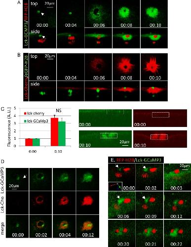 FIGURE 2:. Polar body emission involves significant membrane addition. (A) Time series of an oocyte injected with mRNAs for Lck-GCaMP3 and RFE-H2B during first-polar-body emission. Arrow depicts the cortical spindle pole. (B) Time series of an oocyte injected with mRNAs for Lck-mCherry and GFP-H2B during first-polar-body emission. (C) The graph summarizes relative fluorescence at the cortical region around the spindle (white dotted box) at 00:00 and 00:10 of the same oocyte as in B, with values at 00:00 set as 1. Three oocytes, two experiments. NS, not significant. (D) Time series of an oocyte coexpressing Lck-GCaMP3 and Lck-Cherry imaged at similar time points as in A and B. Arrow, cortical spindle pole. (E) Time series (slightly tilted side view, with coordinates shown) of an oocyte injected with Lck-GCaMP3 and RFP-H2B imaged at metaphase II (00:00) and the indicated time after pricking. Arrow depicts the position of the cortical pole of the metaphase II spindle. Anaphase was noted at 00:12.