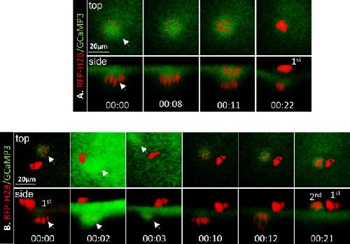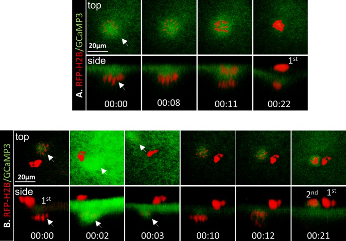 FIGURE 3:. GCaMP3 failed to detect spindle-based calcium signals. (A) Time series of an oocyte injected with GCaMP3 and RFP-H2B imaged during first (1st) polar body emission. Arrow depicts metaphase I spindle (00:00 = 115 min after GVBD). Representative of three oocytes. (B) Time series of an oocyte injected with GCaMP3 and RFP-H2B imaged at metaphase II (00:00) and the indicated time after pricking. Arrow depicts metaphase II spindle. 2nd, second polar body. Representative of six oocytes.