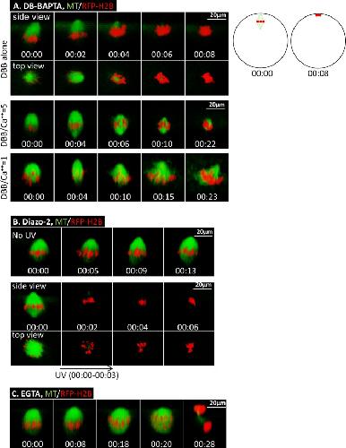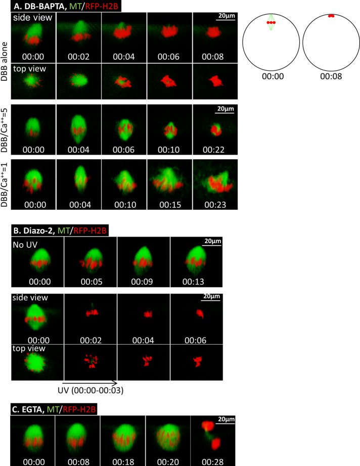 FIGURE 4:. BAPTA Ca2+ chelators, but not EGTA, cause spindle microtubule depolymerization in meiosis I. (A) Top, time series of an oocyte injected with 30 nl of 25 mM DB-BAPTA at 90 min after GVBD. The oocyte was subjected to time-lapse imaging immediately after DB-BAPTA injection (00:00). The schematics on the right depict side views of oocytes at 0 and 8 min after DB-BAPTA injection, respectively. Middle, time series (side view) of an oocyte injected (60 min after GVBD; 00:00) with 30 nl of 25 mM DB-BAPTA mixed with 5 mM CaCl2, depicting more gradual spindle collapse and chromosome clustering. Bottom, time series (side view) of an oocyte injected with 30 nl of 25 mM DB-BAPTA mixed with 25 mM CaCl2 60 min after GVBD, depicting no spindle collapse within a similar time frame. This series is composed of four image segments of the same oocyte, necessitated due to the cortical contraction. (B) Top, time series (side view) of an oocyte injected with 30 nl of 10 mM diazo-2 at 90 min after GVBD (00:00) followed by time-lapse imaging. Bottom, time series of an oocyte injected with 30 nl of 10 mM diazo-2 at 90 min after GVBD. Five minutes after diazo-2 injection, the oocyte was imaged (00:00), followed immediately by UV illumination for 3 min (00:00â00:03) and simultaneous time-lapse imaging. (C) Time series (side view) of an oocyte injected with 30 nl of 25 mM of EGTA at 90 min after GVBD. The oocyte was subjected to time-lapse imaging immediately after EGTA injection (00:00) and shows normal anaphase (00:20) and first-polar-body emission (00:28).