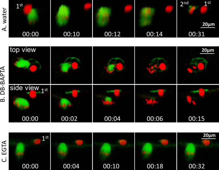 FIGURE 5:. Both DB-BAPTA and EGTA buffers inhibited egg activation, but only DB-BAPTA caused collapse of metaphase II spindle. (A) Time series (side view) of a mature egg injected with 30 nl of water, followed immediately by time-lapse imaging (00:00), depicting anaphase (00:12) and emission of the second polar body (00:31). This series is composed of three image segments of the same oocyte, necessitated because significant cortical contraction required repositioning of the oocyte. (B) Time series of a mature egg injected with 30 nl of 25 mM DB-BAPTA (00:00), followed by immediate time-lapse imaging, depicting the lack of egg activation (no cortical contraction) but rapid collapse of metaphase II spindle. (C) Time series (side view) of a mature egg injected with 30 nl of 25 mM EGTA (00:00), followed by immediate time-lapse imaging, depicting no cortical contraction or changes of metaphase II spindle.