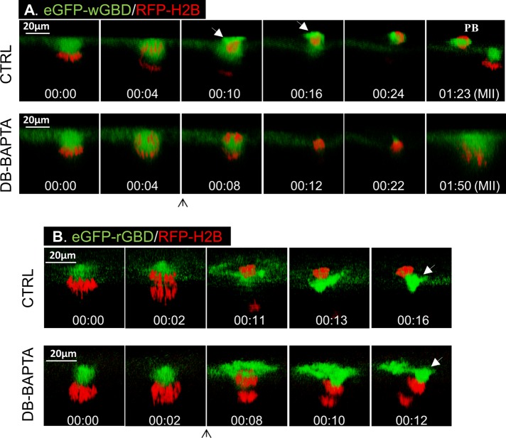 FIGURE 6. DB-BAPTA inhibits Cdc42 activation but not RhoA activation. (A) Top, time series (side view) of a control oocyte showing the active Cdc42 (green) cap overlying the polar body chromosomes (00:10, arrow) and active Cdc42 at the polar body cortex (00:16, arrow). Bottom, time series of an oocyte injected with 20 nl of 30 mM DB-BAPTA immediately after anaphase initiation (upward arrow), depicting the lack of Cdc42 activation or polar body emission. (B) Top, time series (side view) of a control oocyte showing the active RhoA (green) contractile ring (00:11) and constriction “below” the polar body chromosomes (00:13 and 00:16, arrow). Bottom, time series of an oocyte injected with 20 nl of DB-BAPTA immediately after anaphase initiation (upward arrow), showing active RhoA contractile ring (00:08) and constricting “above” both sets of chromosomes (00:12, arrow).