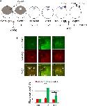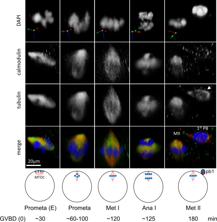 FIGURE 7:. Colocalization of calmodulin with spindle microtubules during polar body emission. Typical confocal images of oocytes fixed at the indicated stages, stained with anti-calmodulin and anti-tubulin, and counterstained with DAPI. The projection orientation is indicated for each oocyte, where the xy-plane is parallel to the oocyte surface and z is perpendicular, pointing toward the center of the oocyte. The approximate time (minutes from GVBD) of each stage is indicated at the bottom. E, early (prometaphase); red, tubulin; green, calmodulin; blue, DNA.