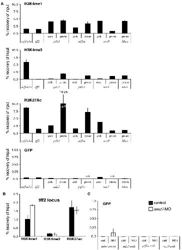 0.05, **P < 0.01, ***P < 0.001. (B) Occupancy of H3K4me1, H3K4me3 and H3K27ac at the tff2