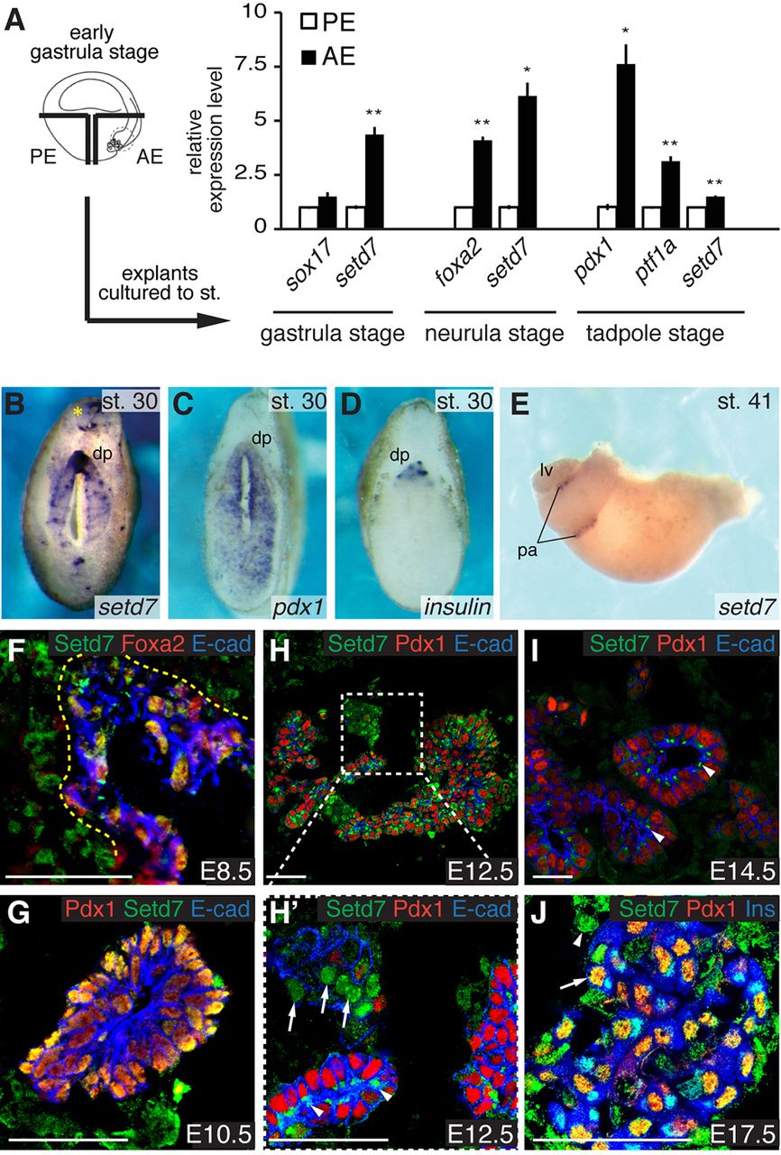 Setd7 in the mouse foregut endoderm (E8.5) and pancreatic rudiments at indicated stages. Data