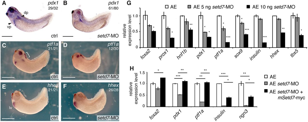 uninjected (ctrl) and setd7-MO-injected (5 ng) Xenopus embryos. Arrowheads indicate dorsal (dp) and ventral pancreatic (vp) buds. Brackets indicate ptf1a