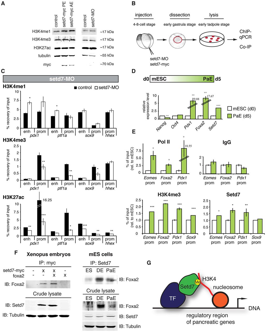 error bars represent ±s.d. *P<0.05, **P<0.01, ***P<0.001. (F) Immunoprecipitation (IP) of Setd7 and Foxa2. Left panel, 4-cell st. embryos were injected with