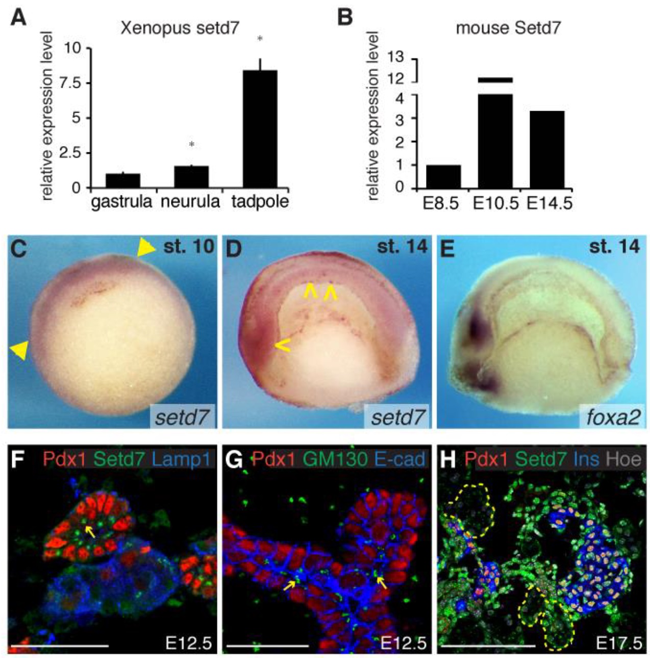 14) Xenopus embryos. In C, yellow arrowheads indicate setd7 transcript in the dorsal cells