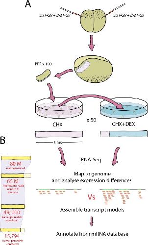 Figure 1. Experimental pipeline and overview of bioinformatic analysis.(A) Both blastomeres of two-cell stage embryos were injected with Six1-GR, Eya1-GR or Six1-GR+Eya1-GR and explants were cut from pre-placodal ectoderm. Explants were incubated in CHX for 30 min before being split into two groups; 50% were kept in CHX for 2.5 hr and 50% were transferred to CHX+DEX for 2.5 hr. RNA was extracted from both treatment groups and submitted to RNA-Sequencing. (B) On average, 80 million reads were generated in sequencing for each treatment group, and 65 million quality-trimmed reads were successfully mapped to the Xenopus genome. An average of 49,000 transcript models were assembled, of which 80% (39,000) were successfully annotated against a Xenopus mRNA database. Annotated transcript models were then filtered to condense duplicate annotations into 15,794 uniquely annotated transcript models, and differential expression analysis was then performed using CHX treated explants as a control for those treated with CHX+DEX.DOI: http://dx.doi.org/10.7554/eLife.17666.003 |