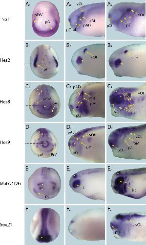 hes5.4 (hairy and enhancer of split 5 gene 4) gene expression in Xenopus laevis embryo, at NF stage 18/19 (C1), NF stage 24 (C2) and NF stage 28 (C3), assayed via in situ hybridization. key: pPrzV profundal/trigeminal placodes; pA anterior placodal area; pAD anterior lateral line placode; pE: epibranchial placode; pO: olfactory placode; vOt: otic vesicle; pLl: lateral line placodes;pM: middle lateral line placode |
