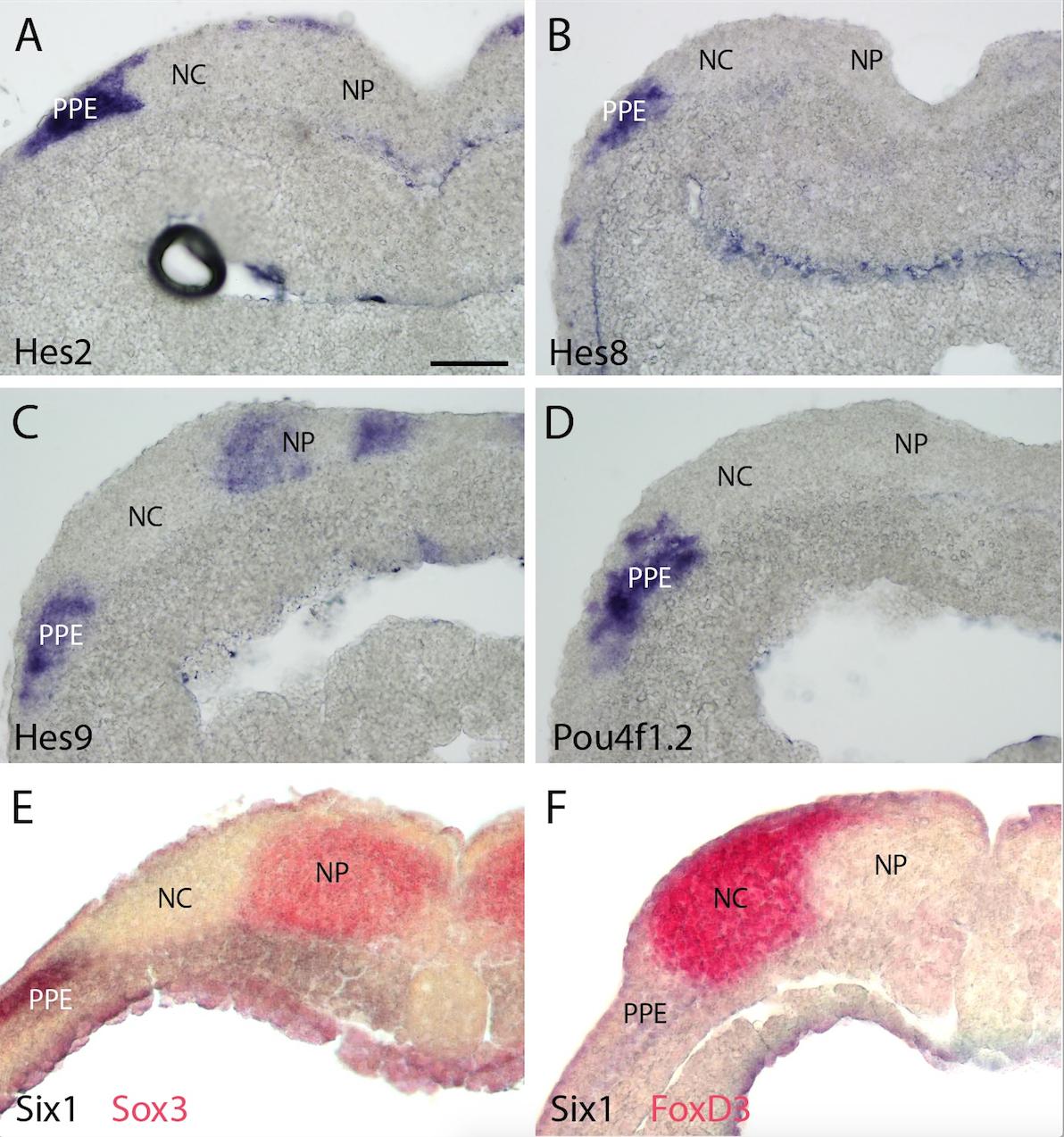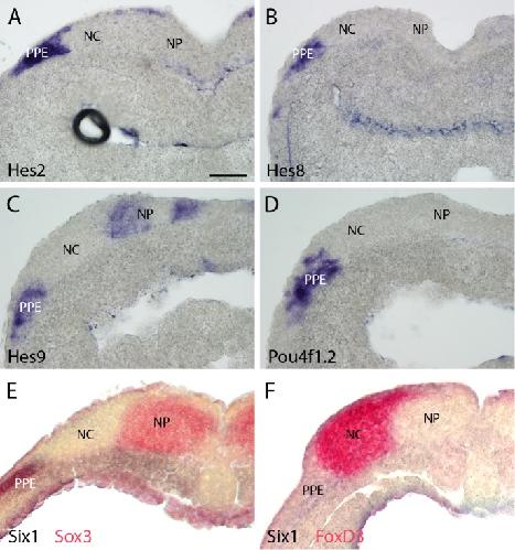 Figure 4âfigure supplement 5. Expression of selected targets in pre-placodal ectoderm (PPE) in sections through neural plate stage Xenopus embryos. Neural crest and (NC) and neural plate (NP) domains are indicated. (AâD): Hes2 (A), Hes8 (B), Hes9 (C) and Pou4f1.2 (D) are all expressed in parts of the PPE (for level of sections see Figure 4 âfigure supplements 3 and 4). While the exact boundaries of NC and NP cannot be determined in these sections, comparisons with sections through embryos stained by double in-situ-hybridisation for the PPE marker Six1 and the NP marker Sox3 (E) or Six1 and the NC marker FoxD3 (F) indicate that expression of each of these target genes is largely confined to the PPE although some overlap with the lateral NC region cannot be ruled out (E and F modified from Schlosser and Ahrens, 2004; Figure 6). Bar in A: 100 μm (also for BâF). |