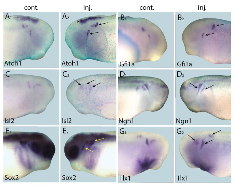 Figure 7. Up-regulation of target gene expression domains after overexpression of Eya1. Tail bud stage embryos (AâG) after unilateral injection of Eya1-GR and DEX induction at neural plate stage (16â18). In each case, lacZ was co-injected as a lineage tracer and panels A1âG1 show the control (un-injected) side and A2âG2 show the injected side. Arrows and arrowheads mark expansions in marker gene expression in placodal and non-placodal derivatives, respectively. |