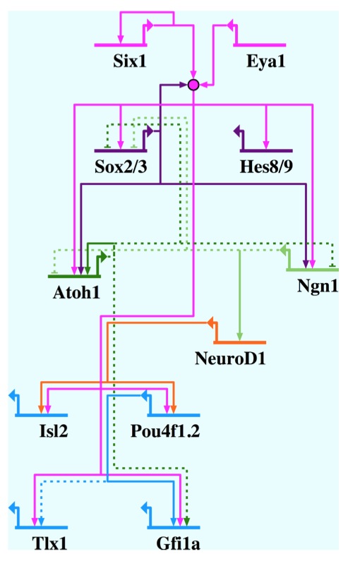 Figure 10. Network summary for Six1/Eya1-activated gene regulation in the PPE. Six1/Eya1 act to promote neuronal differentiation, by activation of pro-neural genes (Ngn1, Atoh1), as well as progenitor state maintenance, by activation of genes such as SoxB1 and Hes genes. Arrows indicate direct (solid line) and indirect (dotted line) activation; barred lines show direct (solid line) and indirect (dotted line) repression. Evidence for interactions: Six1 positively autoregulates (Sato et al., 2012); Six1/Eya1 directly activate Sox2, Sox3, Hes8, Hes9, Ngn1, Atoh1, Isl2, Pou4f1.2, Tlx1 and Gfi1a (this study); Sox2 synergises with Six1/Eya1 (Ahmed et al., 2012b, 2012a); Sox2 directly activates Atoh1 (Ahmed et al., 2012a) and Ngn1 (Cimadamore et al., 2011); Atoh1 and Ngn1 indirectly repress each other (Gowan et al., 2001); Ngn1 indirectly represses Sox2 (Evsen et al., 2013); Ngn1 directly activates NeuroD1 (Seo et al., 2007); Atoh1 positively autoregulates (Helms et al., 2000); Atoh1 indirectly represses Sox2 (Neves et al., 2012) and activates Gfi1 (Wallis et al., 2003); NeuroD1 directly activates Pou4f1.2 (Hutcheson and Vetter, 2001) and Isl1 (Lee et al., 1995); Pou4f1.2 directly activates Gfi1 (Hertzano et al., 2004) and indirectly activates Tlx1 (Hutcheson and Vetter, 2001). |