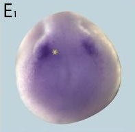 mab21l2 (mab-21-like 2l) gene expression in Xenopus laevis embryo, at NF stage 18/19 (E1), NF stage 24 (E2) and NF stage 28 (E3), assayed via in situ hybridization. key: pL: lens placode; L. lens; Nc; neural crest; arrowheads: midbrain; diamond: spinal cord |