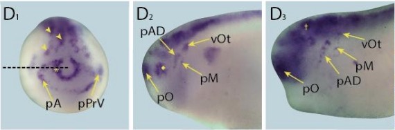 hes5.7 (hairy and enhancer of split 5, gene 7) gene expression in Xenopus laevis embryo, at NF stage 18/19 (D1), NF stage 24-28 (D2) and NF stage 28/30 (D3), assayed via in situ hybridization. KEY: pA: anterior placodal area; pAD: anterior lateral line placode; pM: middle lateral line placode; pO: olfactory placode; vOt: otic vesicle; pPrV: profundal/trigeminal placodes. |
