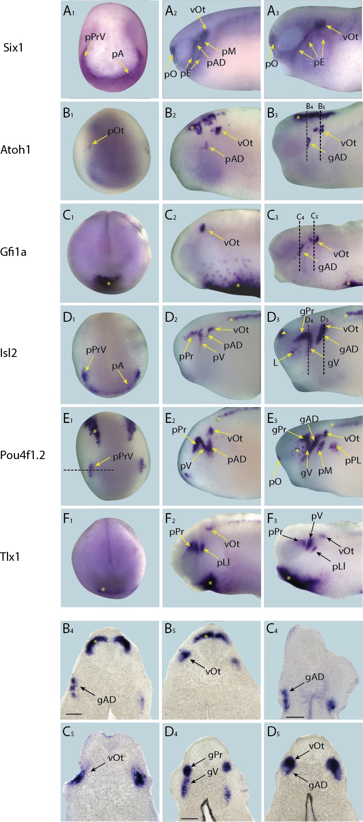 Figure 4âfigure supplement 4. Expression of targets with persistent expression in placodes in whole-mount Xenopus embryos. Expression dynamics for each target are shown across a range of developmental stages: A1âF1 show expression in neural plate stage embryos, A2âF2 show early tail bud stage embryos and A3âF3 show late tail bud stage embryos. B4âD4 and B5 âD5 shows sections at level indicated in B3âD3, respectively (dotted lines). (A) Expression of PPE marker gene Six1 is shown as reference for placodal domains (for details see Pandur and Moody, 2000; Schlosser and Ahrens, 2004). (B) Atoh1 is initially expressed at very low levels in presumptive otic placodes at neural plate stages (B1). This expression becomes more pronounced in the otic vesicle at early tail bud stages (B2) concomitant with the initiation of expression in lateral line ganglia and strong expression in the hindbrain (B2; asterisk). Expression becomes more pronounced in all three regions at late tail bud stages (B3 âB5). (C) Gfi1a is expressed at high levels in haematopoietic cells during neural plate stages (C1; asterisk). At early tail bud stages (C2) expression becomes more pronounced and diffuse, and expression is also initiated in the otic vesicle. At late tail bud stages Gfi1a is expressed in lateral line placodes as well as otic vesicles as the haematopoietic expression begins to subside (C3âC5). (D) During neural plate stages Isl2 is expressed in the profundal and trigeminal placodes and in the anterior placodal region along the anterior edge of the neural plate (D1). At early tail bud stages Isl2 expression is maintained in the profundal and trigeminal placodes/ganglia as well as in otic and lateral line placodes/ganglia and primary neurons in the spinal cord (D2; asterisk). Expression is maintained in cranial ganglia at late tail bud stages (D3âD5) and becomes apparent in the forebrain and lens (D3; arrowhead). (E) During neural plate stages Pou4f1.2 is expressed in the profundal and trigeminal placodes as well as in a stripe of primary sensory neurons (E1; asterisk; see Figure 4âfigure supplement 5 for section). In early tail bud stages (E2) expression in the profundal/trigeminal placodes/ganglia and primary neurons is maintained, and expression in the otic and lateral line placodes is strengthened. Expression is maintained in all domains as well as in the cranial ganglia derived from placodes into late tail bud stages when expression becomes up-regulated in the retina (E3; diamond). Dotted line in E1 indicates the level of section shown in Figure 4â figure supplement 5. (F) Tlx1 is expressed in the presumptive ventral visceral arches at neural plate stages (F1; asterisk). This is maintained into early and late tail bud stages (F2 and F3), which also exhibit prominent expression in the profundal/trigeminal placodes and ganglia and the otic vesicle. Yellow and black arrows mark placodal expression. Bar in B4, C4 and D4: 100 μm (also for B5, C5 and D5, respectively). Abbreviations: pA: anterior placodal region; pAD: anterior lateral line placode; gAD: ganglion of the anterodorsal lateral line nerve; pE: epibranchial placode; pLl: lateral line placodes; L: lens; pL: lens placode; pM: middle lateral line placode; pO: olfactory placode; vOt: otic vesicle; pOt: presumptive otic placode; pPr: profundal placode; pP: posterior placodal region; pPL: posterior lateral line placode; pPrV: profundal/trigeminal placodes; pV: trigeminal placode; gV: ganglion of the trigeminal nerve. |