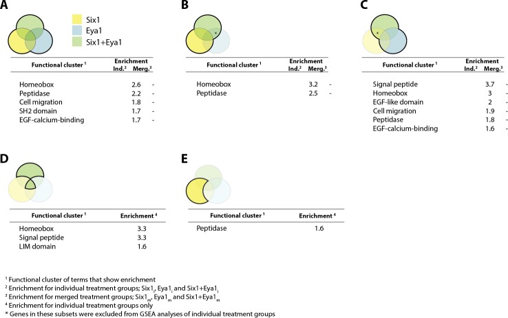 Figure 3—figure supplement 1. Gene set enrichment analysis (GSEA) showing enriched clusters of functional terms for down-regulated genes in different treatment groups.In each case, treatment groups considered are highlighted and outlined in bold in the accompanying Venn diagram. Yellow colouring indicates Six1 treatment; blue shows Eya1 and green Six1+Eya1. Enrichment scores ≥1.5 are reported for individual treatment groups (Ind.) and, where available, ≥0.5 for merged treatment groups (Merg.). (A) Down-regulated genes from all treatment groups included in analysis; (B) Six1 overexpression only; (C) Eya1 overexpression only. (D) Genes differentially expressed after overexpression of both Six1 and Eya1; (E) exclusively after Six1 overexpression.DOI: http://dx.doi.org/10.7554/eLife.17666.006 |