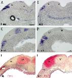 tlx1 (T cell leukemia homeobox 1) gene expression in Xenopus laevis embryo, at NF stage 18/19 (F1), NF stage 24 (F2) and NF stage 28 (F3), assayed via in situ hybridization. key: pPr profundal placode, pLl: lateral line placode, vOT: otic vesicle, pV: trigeminal; ganglion/nerve, * indicates expression in ventral mesoderm surrounding pharynx, heart and anterior foregut regions. |