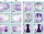 Figure 9. Down-regulation of target gene expression domains after overexpression of Eya1. Tail bud stage embryos (AâJ) after unilateral injection of Eya1-GR and DEX induction at neural plate stage (16â18). In each case, lacZ was co-injected as a lineage tracer and panels A1âJ1 show the control (un-injected) side and A2âJ2 show the injected side. Arrows mark reductions in marker gene expression in placodal derivatives. |