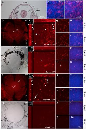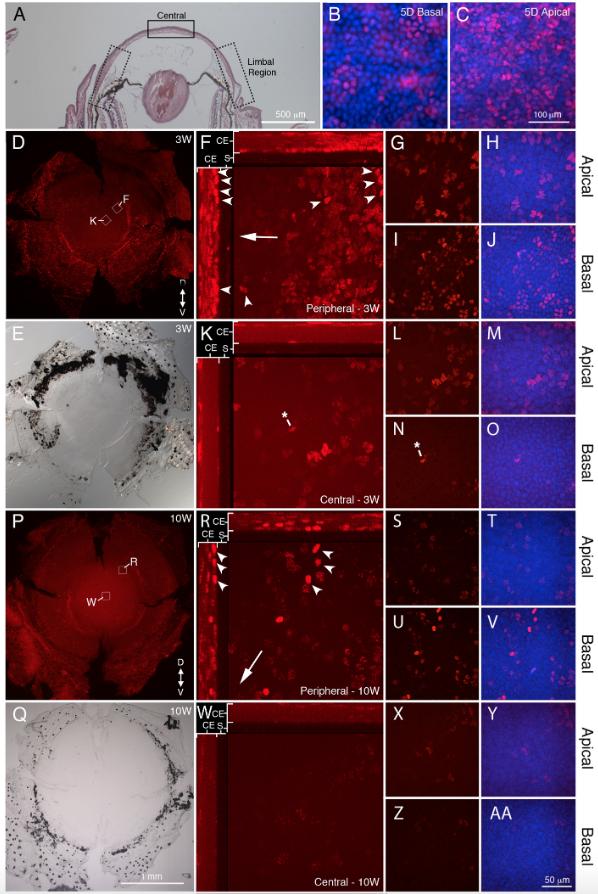 Fig. 1. EdU label retention in post metamorphic corneas. A) Histological structure of a post-metamorphic cornea. Boxes with dotted lines indicate putative limbal regions, and box with solid line indicates central cornea (above pupillary space). After a 5 Day chase, EdU (red) can be observed throughout the basal layer of the epithelium (B) and the more superficial apical layers (C). Scale bar (100 μm) for both B and C is located in C. DAPI labeled nuclei are blue. D-E) EdU label (red) in 3 week (3W) cornea pelt. Boxes indicate locations of central and peripheral images in F-O. F-J) Corneas after 3 week chase show label retention in the peripheral cornea. F) An orthogonal projection of confocal data taken from cornea shown in D reveals the layers of the corneaepithelium (âCEâ) that are retaining signal. The stroma (âSâ) lies beneath the cornea. Arrow indicates the direction to the center of the cornea from the periphery. Arrowheads identify label retaining cells of the basal epithelium. G-H) Apical cell layers from the Z-stack used to create the orthogonal projection in (F). I-J) Basal cell layers from the Z-stack used to create the orthogonal projection in (F). K-O) Central cornea after 3 week chase has very little signal in basal layers, but some signal is still present in apical layers. * denotes macrophage-like cell commonly observed in basal layer of corneaepithelium (K, N). After 10 weeks of chase (P-AA), corneas possess label retaining cells in peripheral cornea (R-V), while the central cornea is relatively devoid of signal and the signal that remains is weak (W-AA). B, C, H, J, M, O, T, V, Y, and AA show an overlay of EdU (red) and DAPI (blue). Scale bar for D, E, P, and Q is 1 mm and is located in Q. Scale bar for G-J, L-O, S-V, and X-AA is 50 μm and is located in AA. Dorsal (âDâ) Ventral (âVâ) axis is shown in D and P.