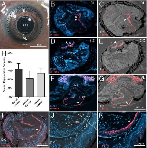 Fig. 2. Regenerative capacity of the mature cornea. A) Zones of post-metamorphic donor corneas. Black dotted line represents putative limbal region. Scale bar in A is 1 mm. B-G) Representative cases of regeneration as defined by positive staining using an anti-lens antibody. Scale bar in B-G is 200 μm. H) Percent regenerative success as determined by the percentage of examined cases expressing lens proteins. Error bars indicate standard error. I) Mature cornea tucked inside larval retina is expressing lens proteins. J-K) Higher magnification showing expression in the same eye as (I) where lens crystallin protein expression is restricted to the basal layer of the corneaepithelium. Scale bar in I is 200 μm. Scalebar in J and K is 100 μm. J) Structure of mature cornea inside larval eyecup. Abbreviations: DL, dorsal limbal region; VL, ventral limbal region; CC, central cornea; S, stroma; CE, corneaepithelium; LR, larval retina; K, keratocytes; BE, basal cells of corneaepithelium; AE, apical cells of corneaepithelium.