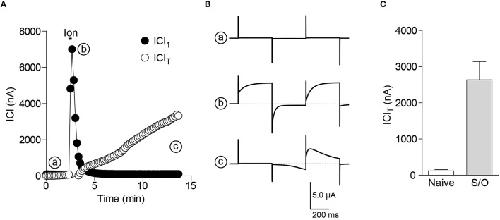 Figure 2. CaCC as an endogenous sensor for Ca2+ release and SOCE in the oocyte. (A) Simultaneous reading of ICl1 and IClT show the transient increase in ICl1 (b) during store depletion by ionomycin (10 μM, 20 s) and the following increase in IClT due to SOCE activation (c). (B) Currents traces corresponding to the different time points in (A). (C) Bar chart illustrating the increase in the ionomycin-induced SOCE (IClT) in cells expressing STIM1 and Orai1 (S/O) compared to uninjected oocytes (Naïve).