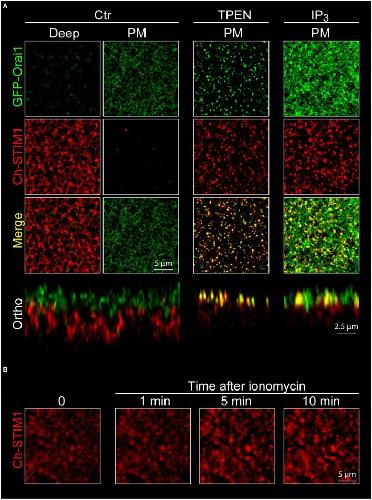 Figure 4. Confocal imaging of STIM1 and Orai1 in Xenopus oocytes. (A) Confocal z-stacks are obtained from oocytes overexpressing mCherry tagged STIM1 (Ch-STIM1) and GFP-Orai1. The pinhole aperture is set to 1 Airy unit and the images are taken every 0.5 μm. Two selected planes are illustrated, the Plasma Membrane (defined as the maximum expression level of GFP-Orai1) and the intracellular/ER compartment (Deep) approximately 10 μm deep in the cell and at the maximum of Ch-STIM1 expression in control conditions (Ctr). Treatment of the cells with TPEN (5 mM, 10 min), IP3 (2.5 μM final) induces the translocation of Ch-STIM1 to the plasma membrane and the co-clustering of the proteins, visible as dense yellow dots in the merged images. Below each panel (Ctr and TPEN) is an orthogonal reconstitution (Ortho) of a plane perpendicular to the membrane illustrating the distribution of both proteins across the z-axis. (B) Timeline of the formation of Ch-STIM1 clusters following application of ionomycin (10 μM). The images are captures using an open pinhole aperture on the confocal to compensate for the vertical movement of STIM1.