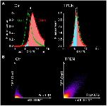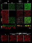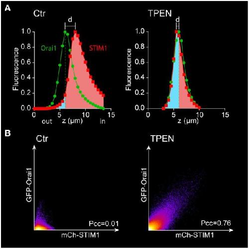 Figure 6. Analysis of the movement of STIM1 and Orai1 after store depletion. (A) The fluorescence intensity of each channel is plotted vs. the position on the z-axis and normalized to its maximum. The separation between the Ch-STIM1 and GFP-Orai1 peaks disappears after store depletion induced by TPEN due to co-localization of both proteins at the membrane focal plane as illustrated in Figure 4. The translocation of the STIM1 proteins can also be highlighted using the area under the curve with a reference point set at the peak of the Orai1 signal. The intracellular fraction is labeled in pink and the “membrane” one (above the Orai1 peak) in blue. (B) Co-localization plots of mCh-STIM1 and GFP-Orai1 fluorescence obtained at the membrane plane (defined as the maximum of the GFP-Orai1 signal) before and after store depletion by TPEN. The Pearson's correlation coefficient (Pcc) is indicated on each plot.