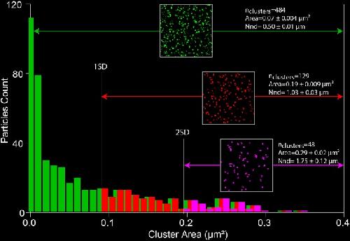 Figure 7. Measuring SOCE clustering parameters. A thresholded image of the Orai1 clusters (from Figure 4) is processed with the “analyze particle” plugin of ImageJ. The distribution of the areas of individual clusters is analyzed and the SD of the data is used to define a cutoff value that allows limiting the size of the analyzed particles. The nearest neighbor distance gives a measure of the cluster density (NND).
