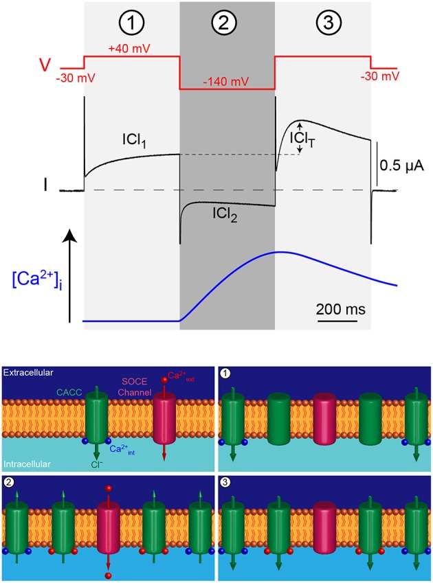 Figure 1. Triple voltage jump protocol used to monitor the intracellular Ca2+ concentration ([Ca2+]i) in the Xenopus oocyte. The first depolarizing jump (1) measures the Cl− current through CaCC at rest or during Ca2+ release from intracellular stores, mirroring [Ca2+]i. The hyperpolarizing voltage jump (2) drives Ca2+ through SOCE channels that in turn induce Cl-efflux. The final depolarizing pulse (3) reports the activation of the CaCC by the Ca2+ influx produced during the previous hyperpolarizing pulse (blue trace). The difference between current obtained in 1 and 3 is termed IClT and reports Ca2+ influx.